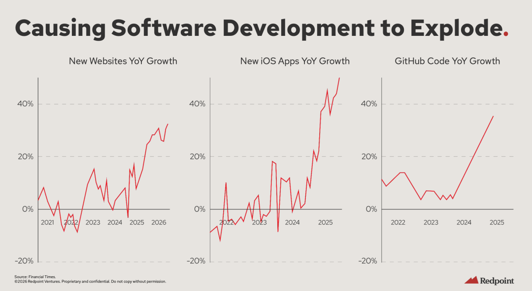 数据也在印证这一点。从下图可以看出,2024年之后软件开发量迎来了爆发式增长。我们完全有理由相信,随着AI能力越来越强、掌握AI Coding的人越来越多,这个势头还将持续,直至迎来一个新的供需平衡。
