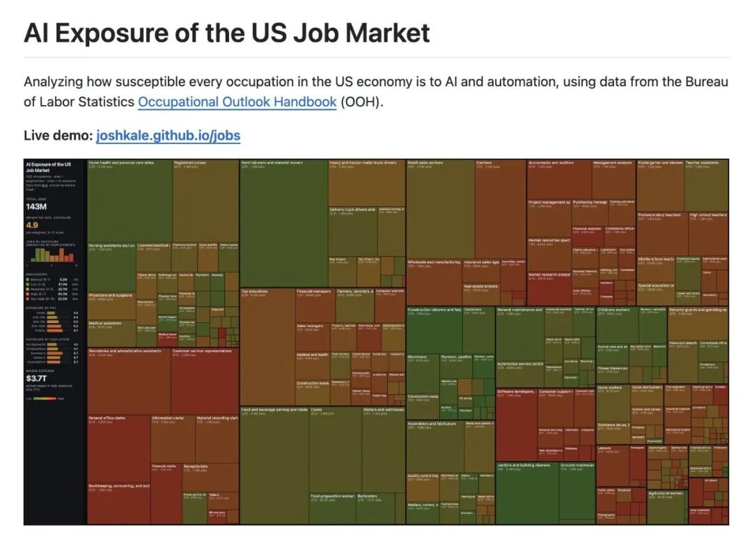 Andrej Karpathy前不久对美国不同职业的「AI暴露度」做了量化:大约42%的职业处在较高AI暴露度区间,横跨多个领域,以白领工作为主。