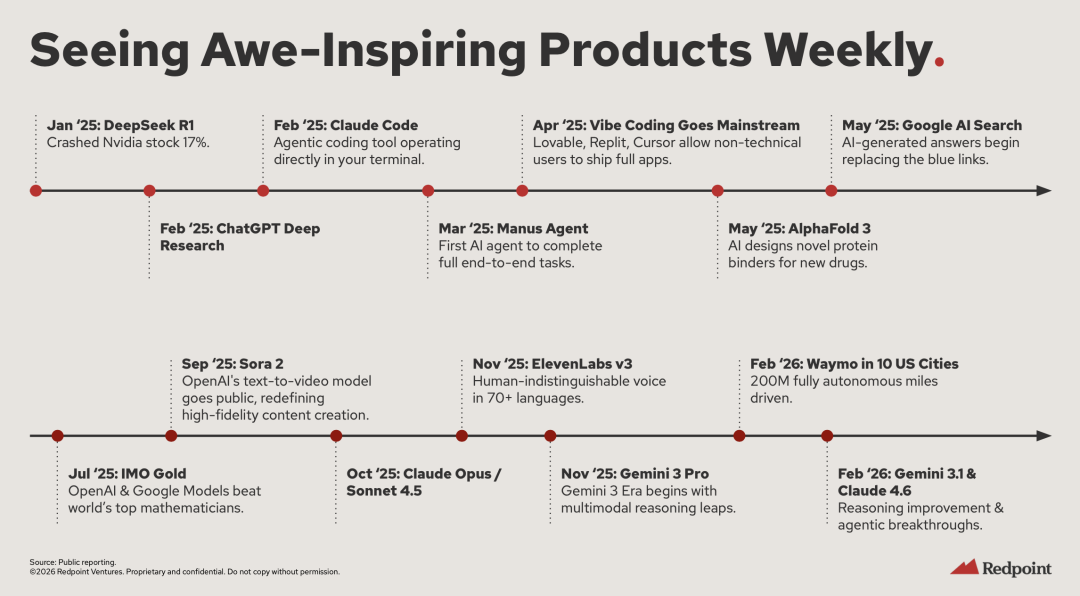 从下图我们能看到,过去一年里,每隔几周就会出现标志性的AI产品创新。在AI Coding能力取得新突破之后,这一速度还在加快。
