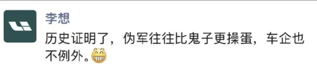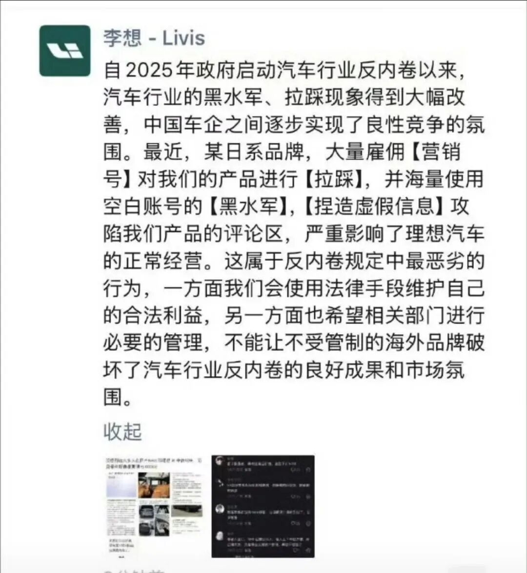 所以李想说了一句话,我觉得是这次事件里最点睛的一句——"连日系品牌都知道,用水军拉踩理想汽车是最安全的。"