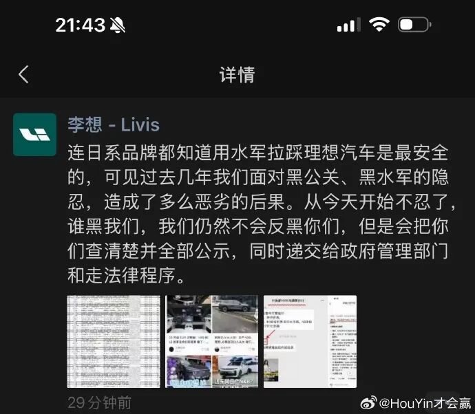 李想说,从今天开始不忍了。不反黑,但全部公示,全部走法律程序。