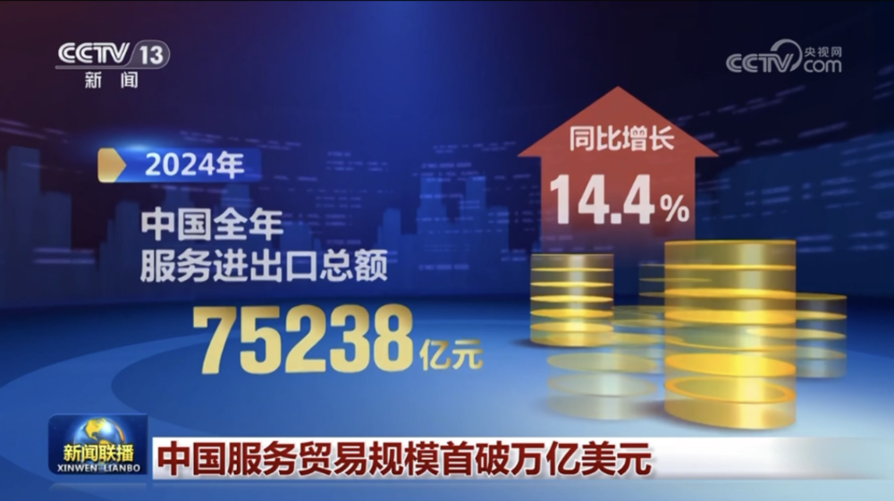 2024年,中国服务进出口总额总额史无前例地跨越了1万亿美元(7.5万亿元人民币)的门槛。