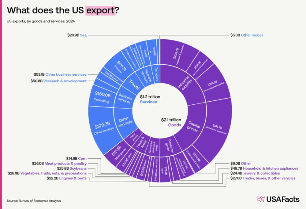 2024年,美国商业服务,仅出口就高达1.2万亿美元,是中国的数倍。