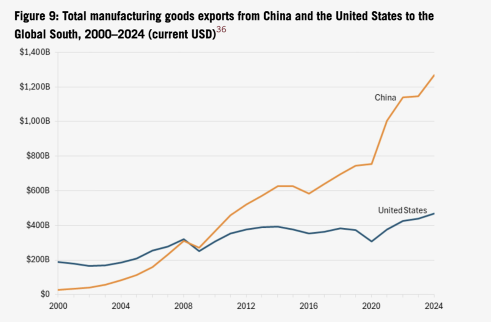 自21世纪初以来,中国对发展中国家的制造与技术出口增长了44倍,而美国仅增长了2.5倍。