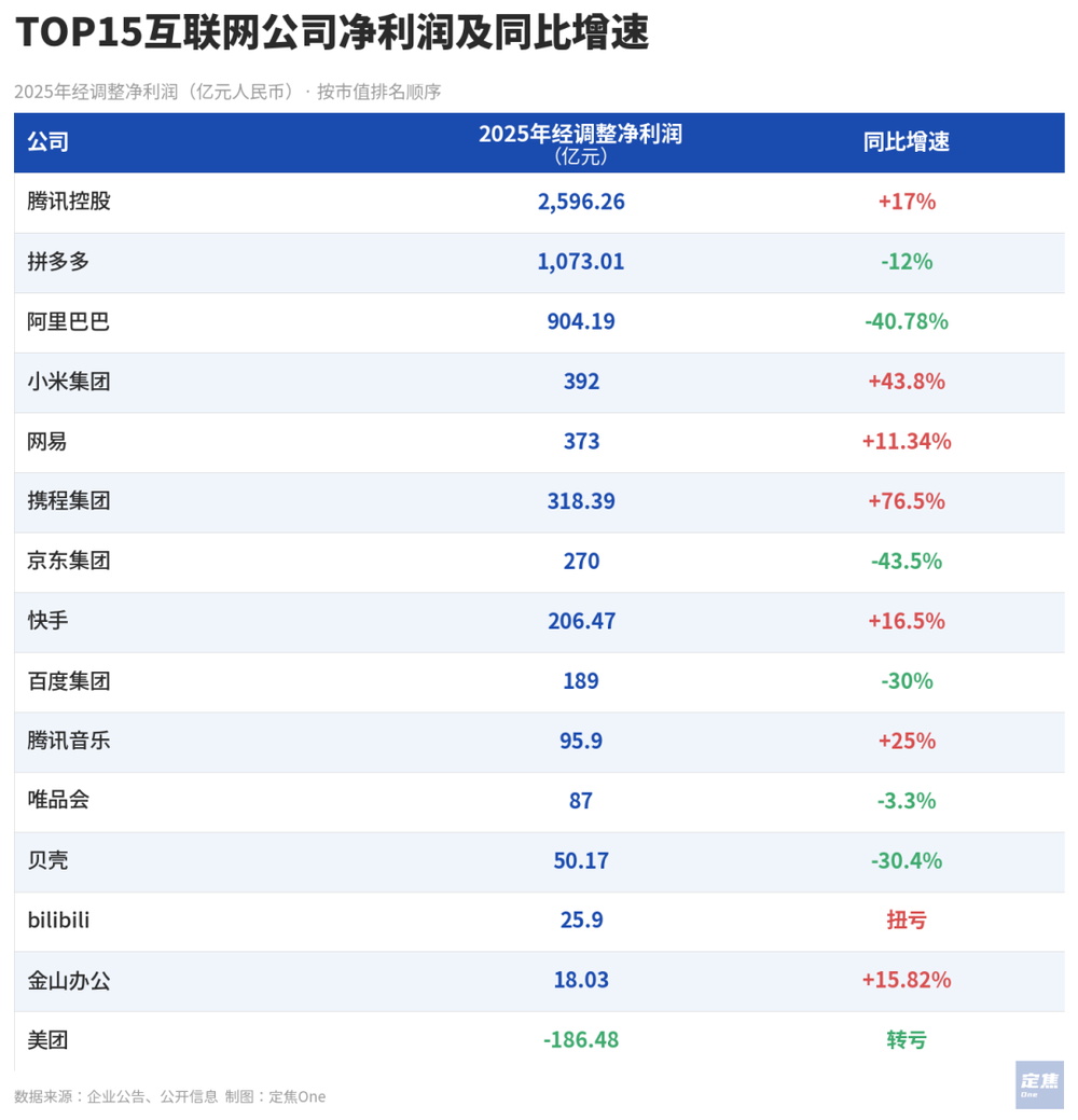 以市值划分,腾讯和阿里在2025年坐稳了头部互联网大厂的位置,而这两家的财报在过去一年也代表了互联网行业的两个极端。