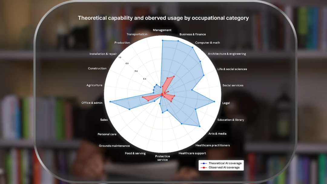 主持人:你看到Anthropic本周发布的报告了吧?简而言之它的内容和你刚才说的很吻合。Anthropic深入研究了人们究竟是如何使用他们的模型的,发现初级职位的数量减少了40%。他们在网上疯传的图表预测,虽然建筑和农业等物理世界的实体工作尚未受影响,但行政、金融、数学、法律和医疗保健等领域将首当其冲。包括媒体和艺术领域,这么看我快彻底完蛋失业了。