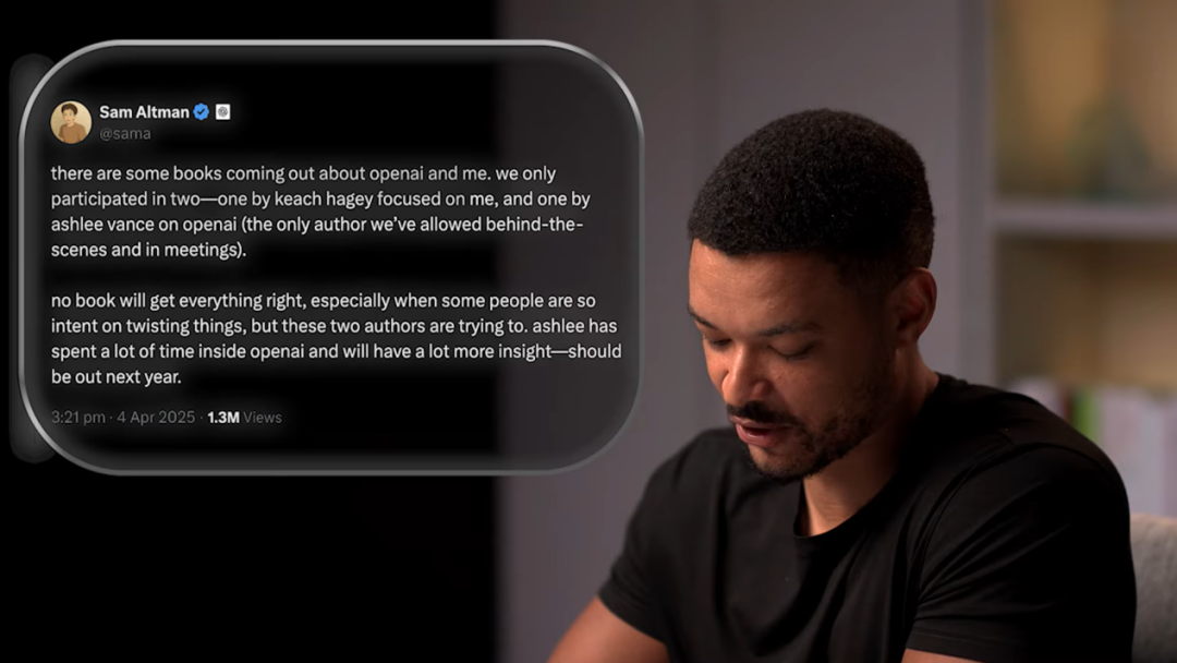 主持人:Sam Altman发了一条推文说:“有几本关于OpenAI和我的书即将出版。我们只参与了其中的两本。没有哪本书能做到事事准确,尤其是当某些人执意要歪曲事实的时候,但这两位作者确实在努力尝试。”你转推了那条推文并写道:“那本未点名的书正是我的作品。”你认为Sam Altman那条推文是指向你的书吗?