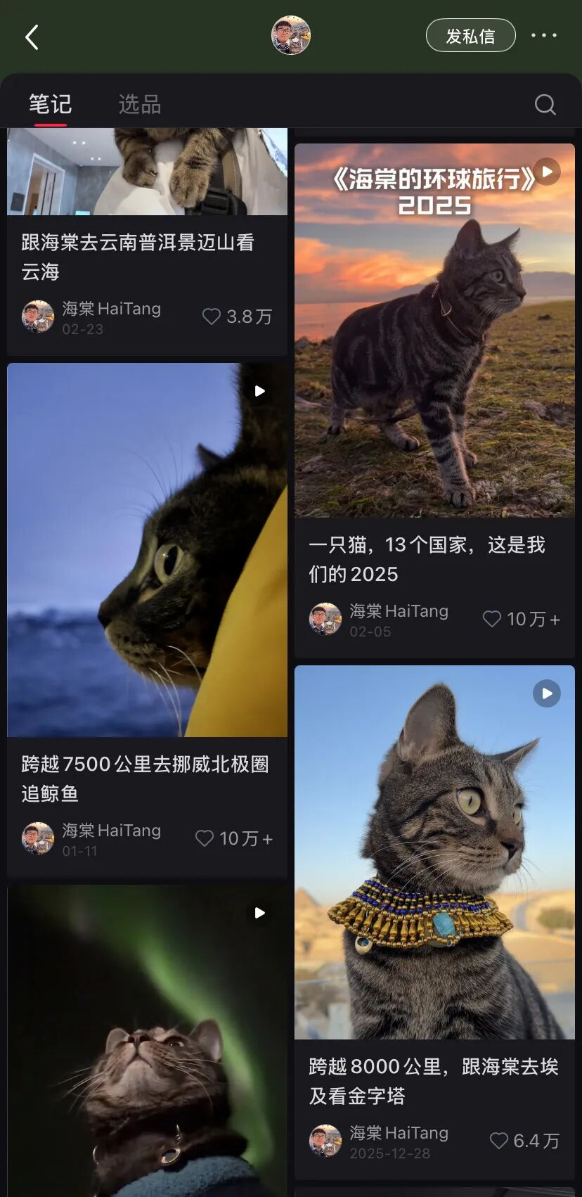 最让人羡慕的携宠出行,当属@海棠HaiTang。博主带着小猫海棠出入商务舱,在广西涠洲岛的游船、内蒙古的草原都撒过野,足迹远至土耳其和北欧,仅去年一年就周游过13个国家。