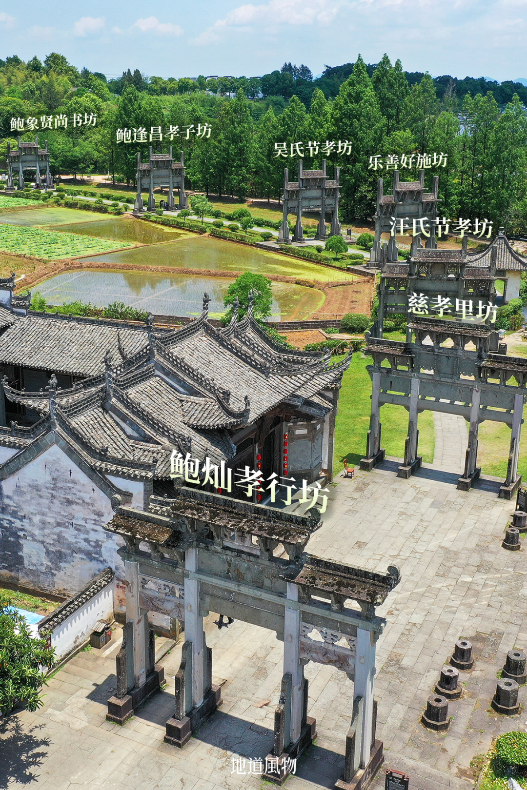 歙县的另一处牌坊群更为显眼。棠樾石牌坊群坐落于郑村镇棠樾村,由七座明清建筑石牌坊构成,其中前五座为四柱三楼冲天样式,后两座为四柱三楼门楼式。这七座牌坊表彰的内容包括了忠、孝、节、义,群坊矗立在长堤一线,一直是游客必来打卡的景观。