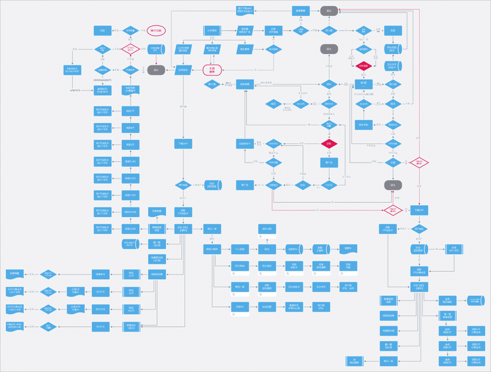 在调研方面,我还用到了一点技巧,就是使用流程图的方式记录产品体验过程,让我从全局上看出运营不合理的地方。例如目前拒绝充值书币后,用户只能选择退出应用。如果看到微信读书为了获客努力丰富娱乐内容,就知道得到一个新用户有多不容易,不应轻易让用户退出应用,导致流失,而应争取挽留一下——引导用户下载APP赚书币。