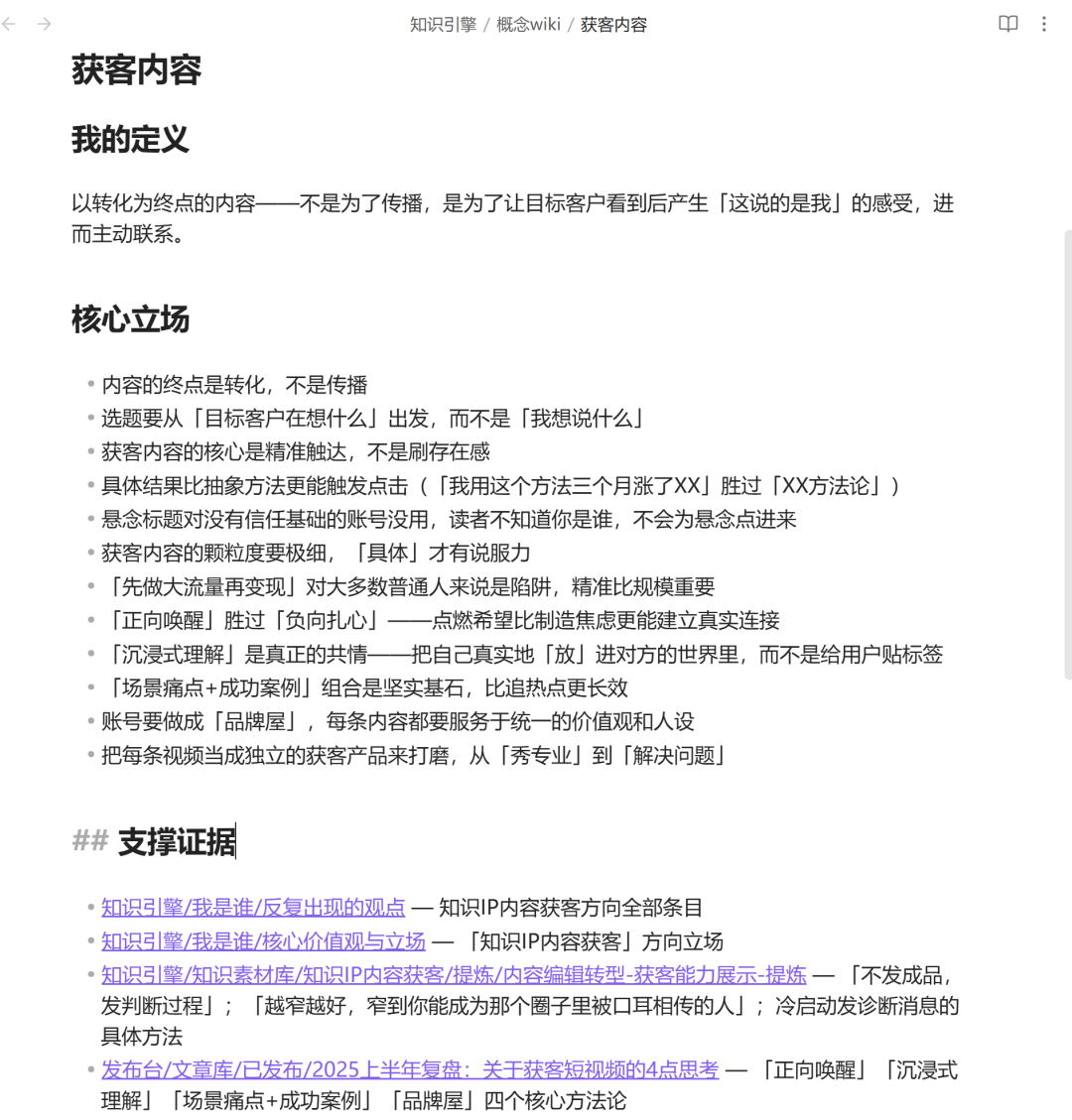 举个具体的例子:一篇关于获客的文章进来,AI不是把它存档,而是把里面的观点拆出来,合并进「获客内容」这个概念页。已有的观点补充细节,和现有观点矛盾的单独标注,完全新的概念另起一页。