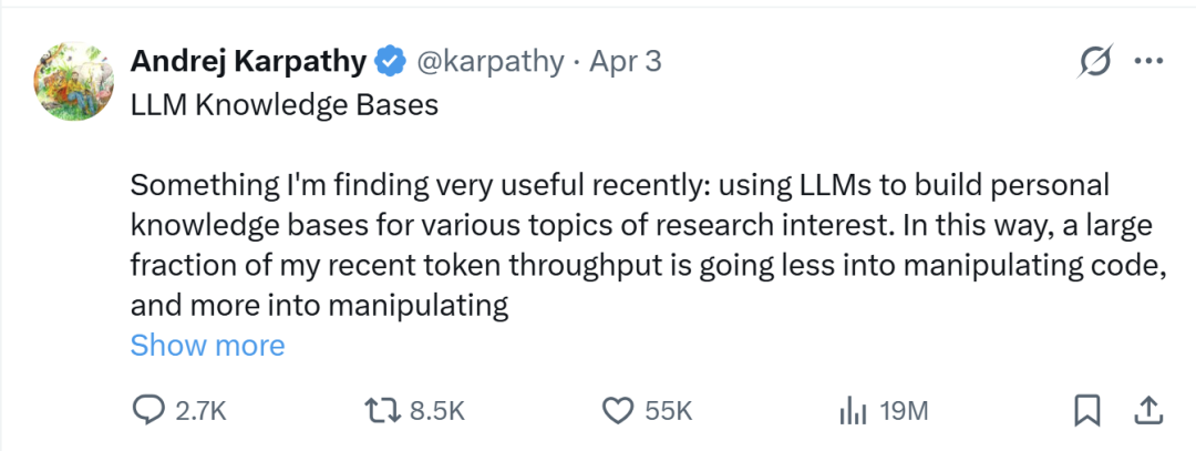 特斯拉前AI总监、OpenAI联合创始人Karpathy,把这个叫每次都在重新发现。他在推特上发了一篇关于LLM-Wiki的帖子,在AI圈和知识工作者圈迅速传开,现在已经有1900多万人看过。