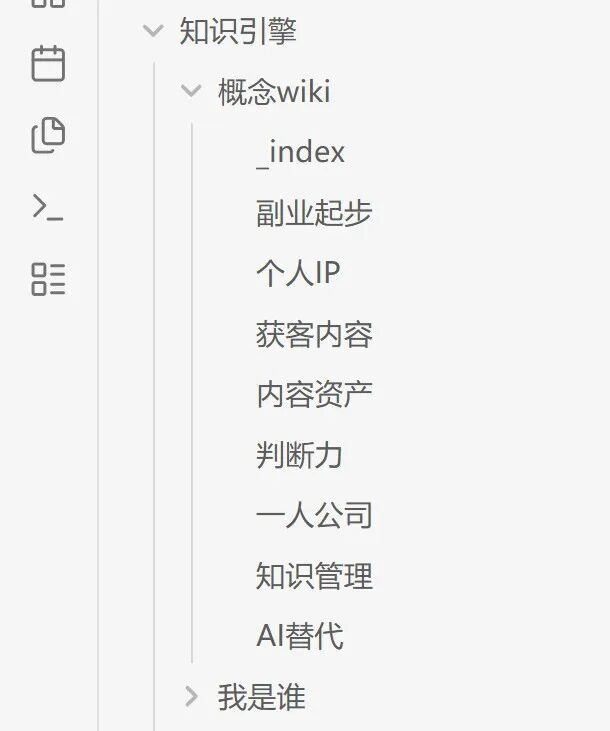 这是新加的核心层。我目前有7个概念页:判断力、AI替代、获客内容、内容资产、一人公司、个人IP、副业起步。