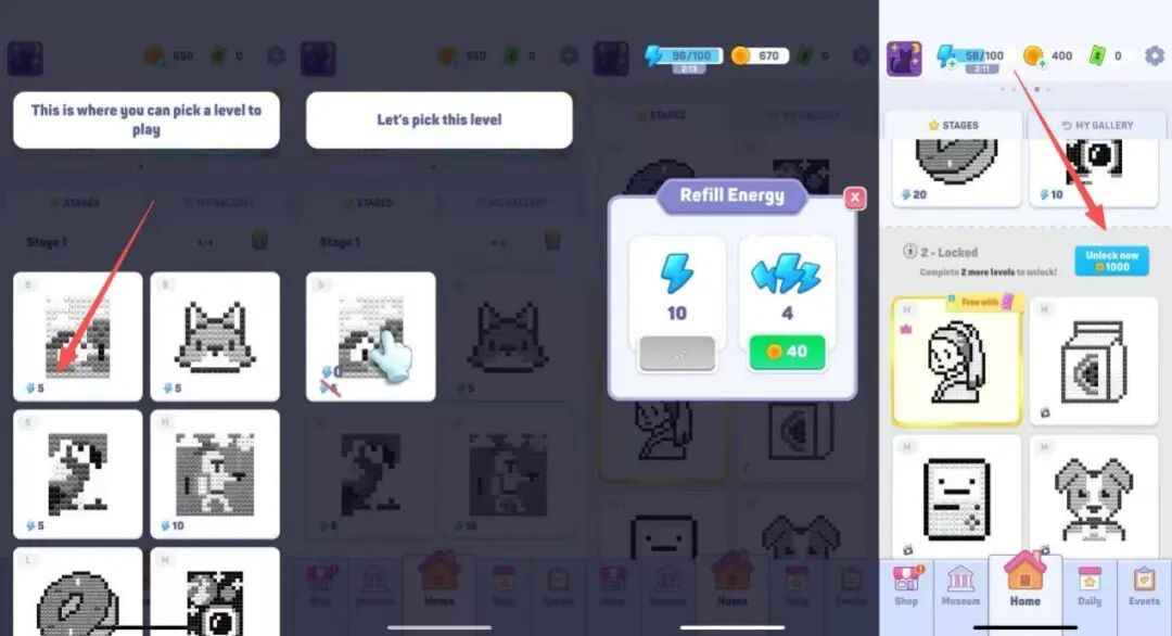 尝试玩教学关后,玩家就要开始探索主线。游戏的主线关卡被做成了至少6个一组的分组,玩家必须要全部通关才能解锁下一组,否则就要花硬币购买。