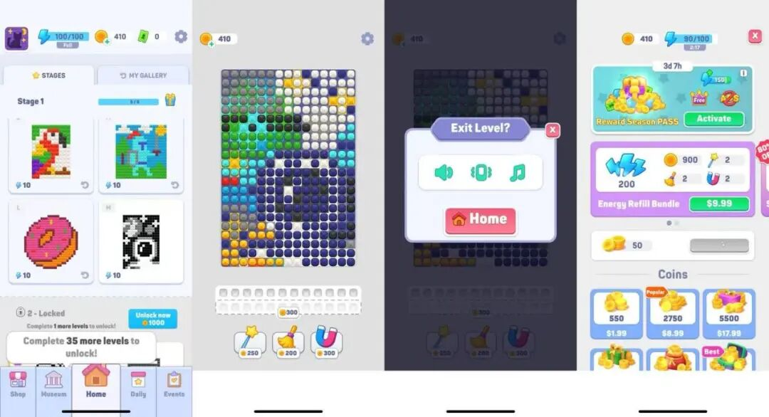 「Jewel Coloring」的登顶,证明了线下“拼豆”玩法在线上的“吸量”体质,但如何将人气转为内购收入,「Brilliant Sort」给出了自己的答案。