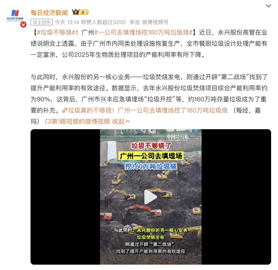 广州兴丰应急填埋场就在之前获批开挖存量垃圾。永兴股份披露,2025年一年就累计掺烧了约160万吨陈腐垃圾。
