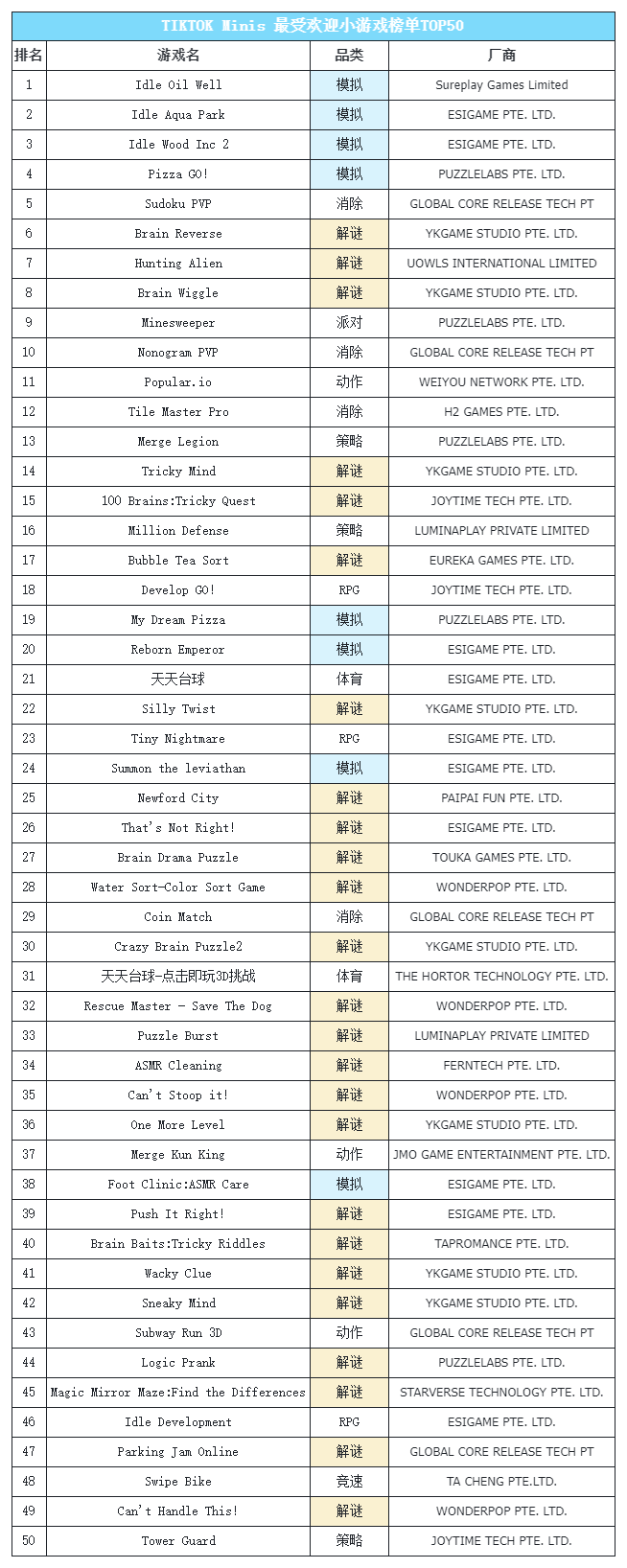 拉通榜单来看,我们很容易发现一些规律,比如在TikTok小游戏榜单前列,模拟和解谜类游戏的占比非常高。