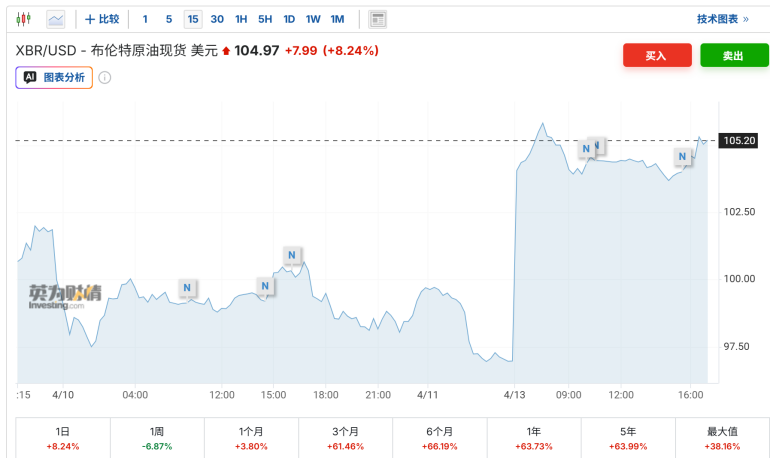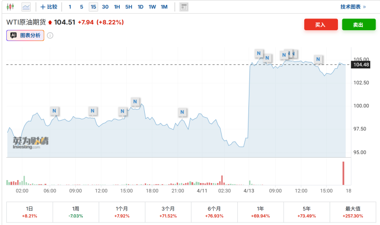 随着霍尔木兹海峡再次关闭,4月13日,国际油价再次突破每桶100美元。截至北京时间17时23分,5月交货的WTI原油价格报每桶104.51美元,涨幅为7.94%。布伦特原油现货的价格报每桶105.97美元,上涨7.99%。