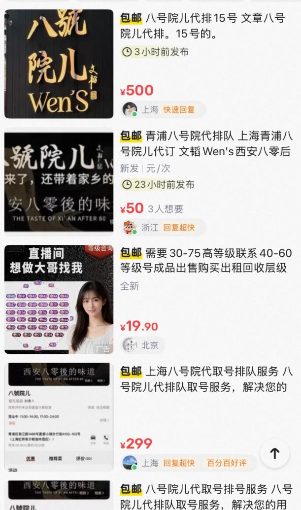 “11点放号,七八点就有黄牛去排队”一位消费者表示,如今刚开业红极一时,但明星效应迟早会减退,不必要跟风。目前在闲鱼上,已经有多个账号经营八号院儿代排队取号业务,实际价格从200元到500元不等。