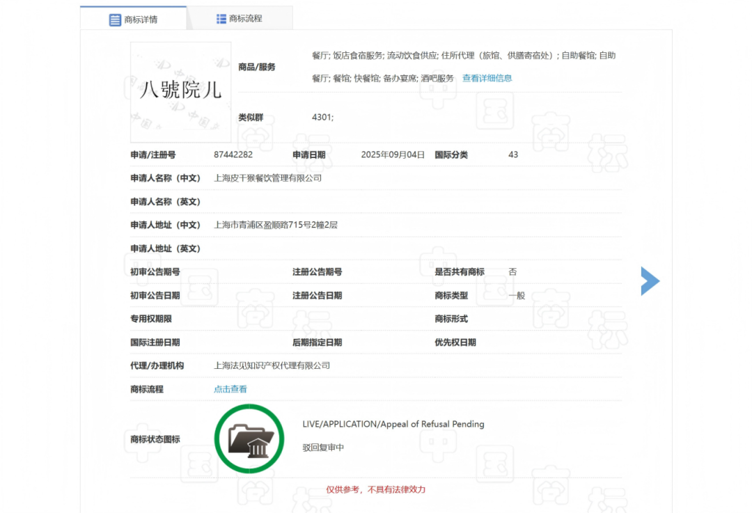 从中国商标网查询获悉,皮干猴餐饮于2025年9月申请注册“八號院儿”商标,涉及三个类别,其中国际分类29、35的注册已经于今年3月初审通过,国际分类43的初审被驳回。