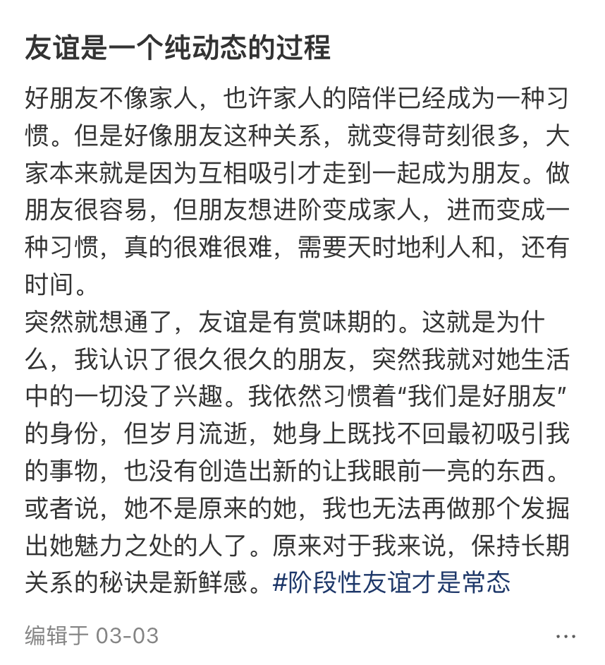 小红书网友@Astra Cake这样形容她和朋友的关系:「友谊是有赏味期的。岁月流逝,我认识了很久的朋友身上已经没有最初吸引我的事物,也没有创造出新的让我眼前一亮的东西。她不是原来的她,我也不能再发掘出她的魅力了。」