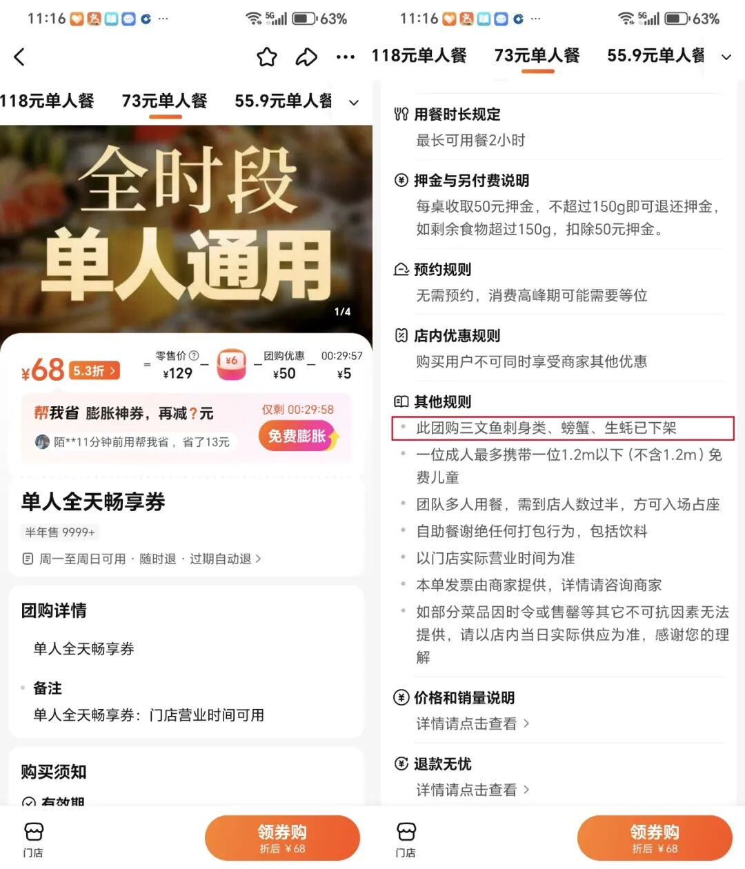但是又有明显标注,此团购三文鱼刺身、螃蟹、生蚝已下架。