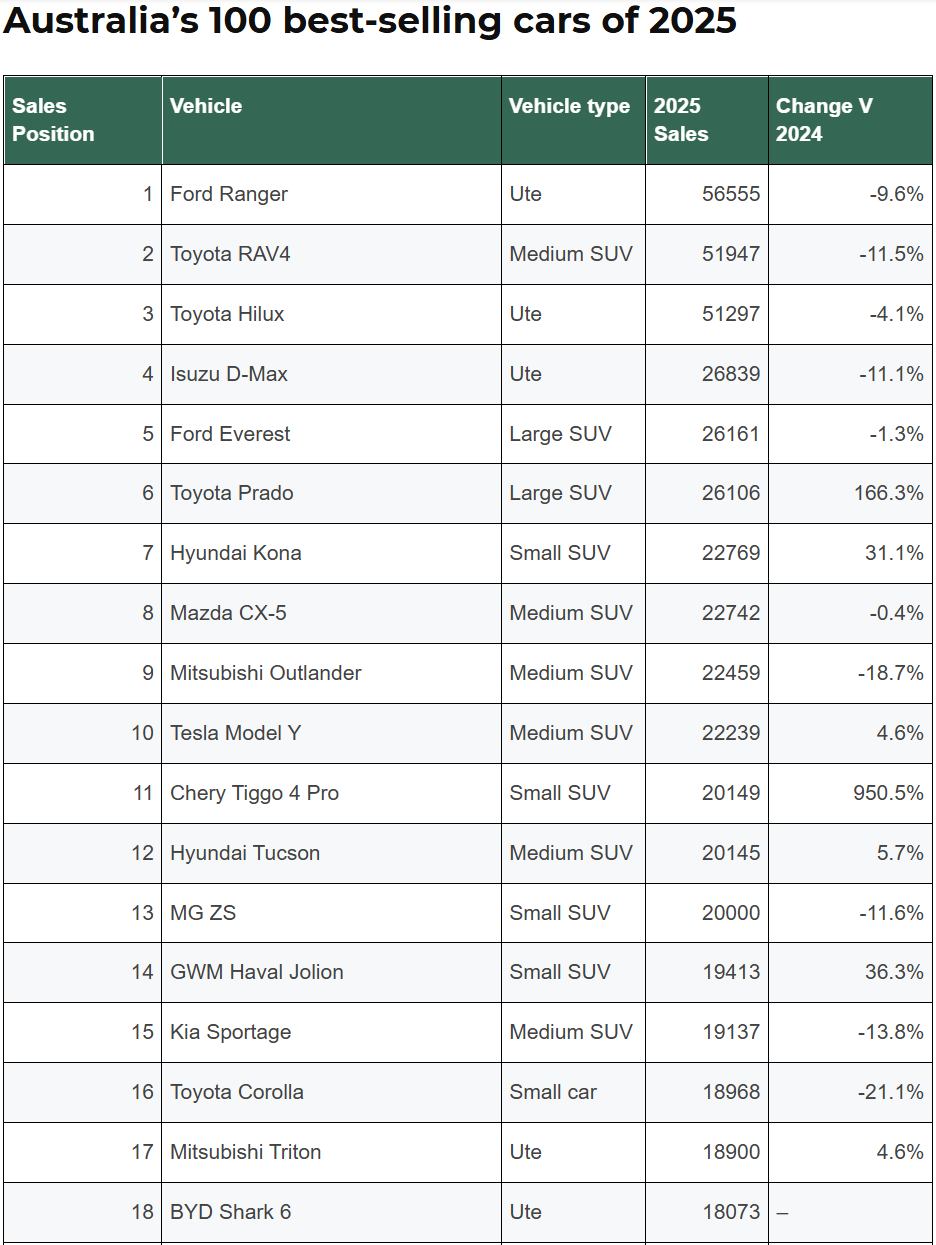 与此同时,与德国畅销车型既有大众高尔夫、欧宝Corsa这类小车,也有奥迪A6为代表的轿车和以宝马5系为代表的SUV不同,澳大利亚2025年最畅销的100款车型榜单,完全被皮卡和SUV占据。