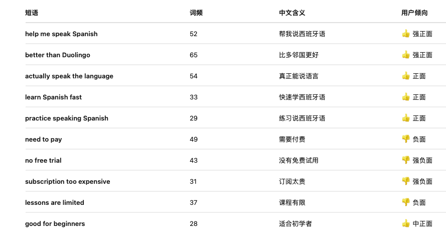 回看美国的这次增长,我们在用户评论中找到了相关痕迹,美国用户使用Speak的原因是开口说西班牙语,用户评论中“Spanish”出现频次非常高,且基本与“Speak/Practice”等关键词绑定出现。