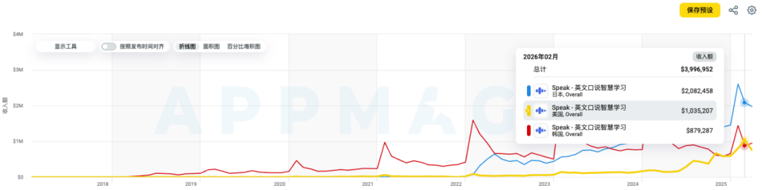 但今年,Speak的一个明显变化是,除了日韩2个主力市场之外,美国市场流水增幅尤其大,2月美国分成后收入已超过爱学英语的韩国,成为Top2收入市场。