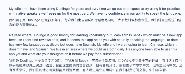 而另一个高频出现的词是Duolingo,“better than Duolingo”短语出现了66次,排名第二。而在Reddit上,有用户现身说法,他表示自己和妻子用Duolingo学了好几年西班牙语,但出门真的遇到西语母语者,大多时候都会卡住,对自己说这门语言毫无信心,希望尝试一下Speak。