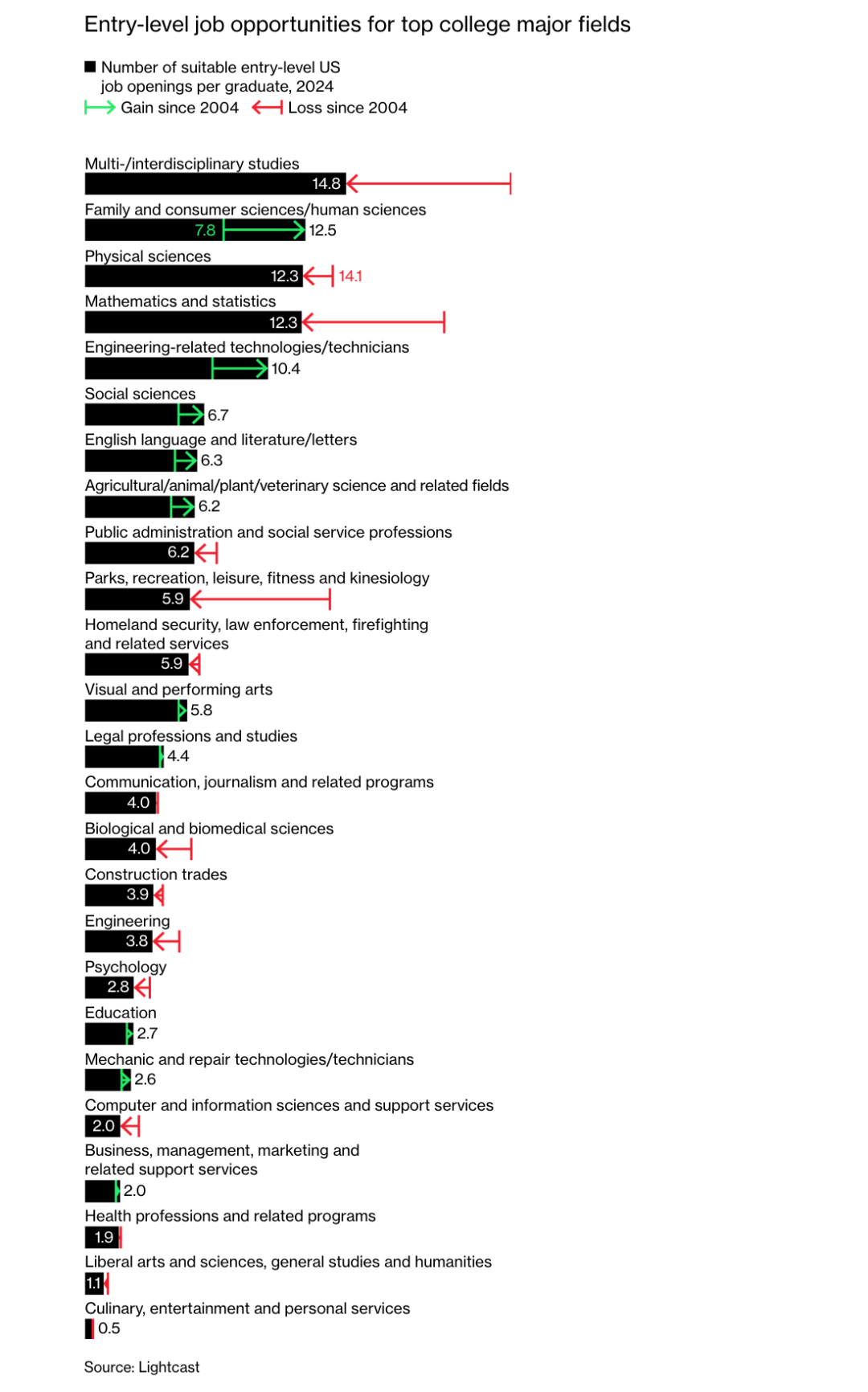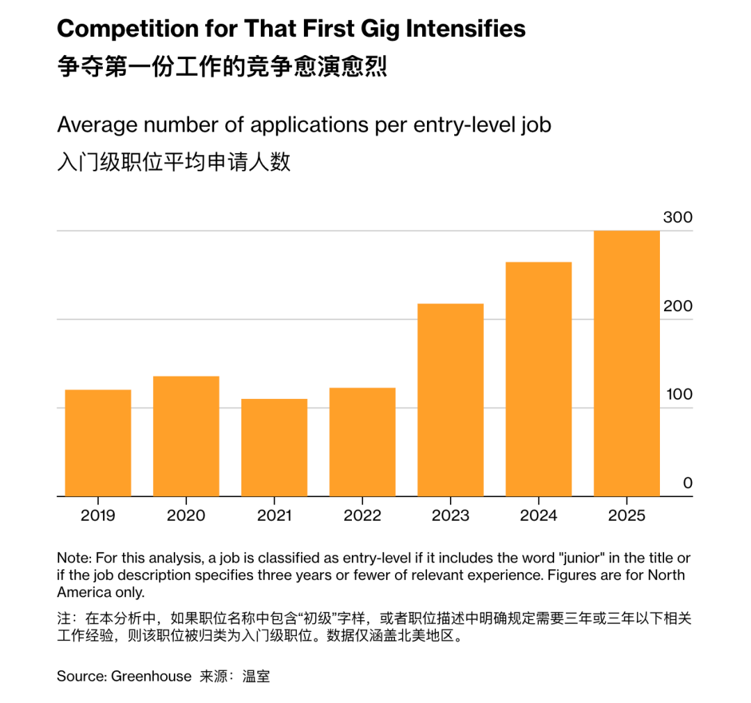 过去20年,美国大学毕业生数量增长了54%。同期,适合这些毕业生的入门级岗位只增长了42%。供给跑在需求前面,缺口逐年扩大,到2025年终于逼近临界点。