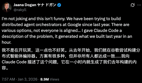 今年1月,Google Gemini API团队的Principal Engineer Jaana Dogan在X上发了一条帖子,迅速获得了数百万次浏览。