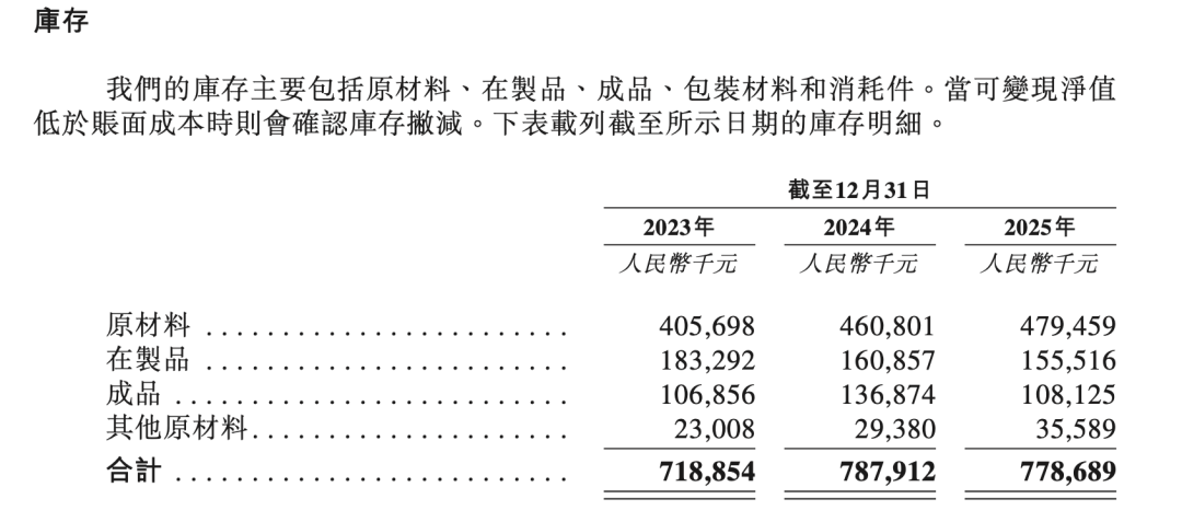 吊诡之处在于,2025年上半年,宜品的存货周转天数从307天飙升至361天,如果原因只是延迟发货,那下半年恢复发货,存货总额,尤其是成品库存应该大幅下降。但真实情况是,宜品的存货总额从2025上半年的8.02亿降至年末的7.79亿元,仅微降0.23亿元。其中,成品库存减少0.14亿元,成品出货量并不大。与此同时,占总存货61.6%的原材料库存从上半年的4.95亿元减少至2025年末的4.79亿元,环比下滑仅3%,说明生产端对库存的消耗量同样非常有限。