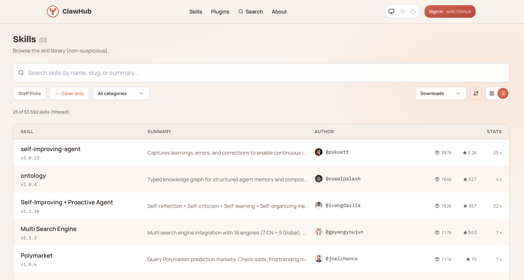 OpenClaw的官方技能商店ClawHub|图片来源:ClawHub