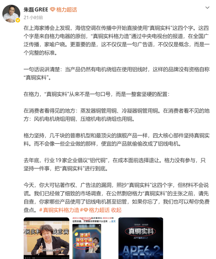 昨日晚间,格力电器CMO朱磊于社交平台喊话海信空调,直言其在上海家博会传播中盗用格力“真铜实料”营销主张,同时喊话海信自查旗下产品铝线电机、铝管应用情况。