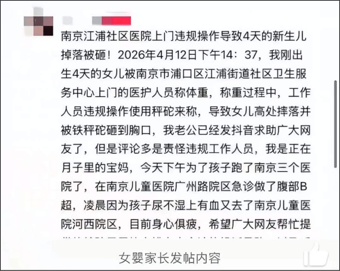 宝宝本来一直在哭,被砸后哭声停了。这静音可把月子期里的宝妈吓坏了,她和老公赶紧带孩子跑了好几家医院。