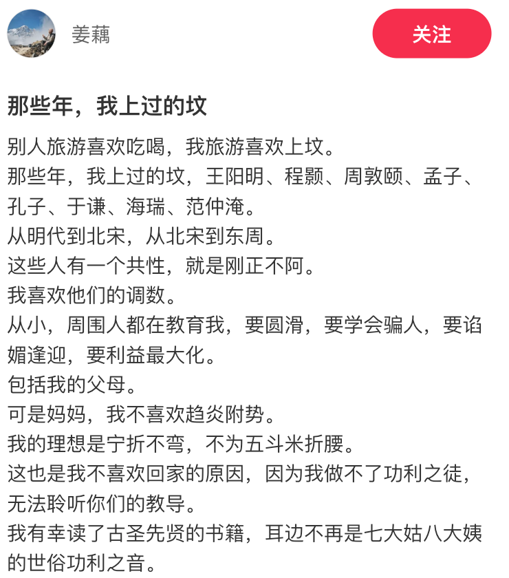 有人说,自己欣赏的从来都是那些刚正不阿的人。正因为读了古圣先贤的文字,才听不得世俗功利之音。