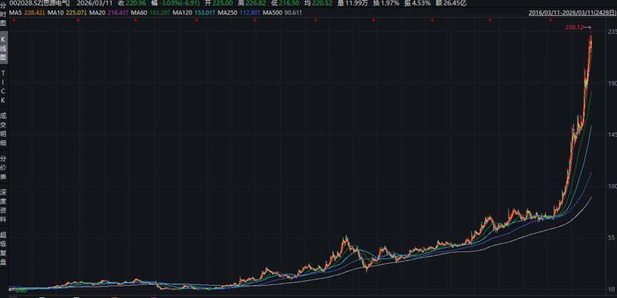 截至2026年4月15日,思源电气收盘价报209.58元。以前复权口径计算,近十年区间累计涨幅达24倍。