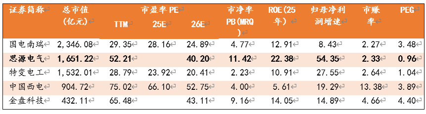 图:同业估值对比;备注:国电南瑞、特变电工及中国西电25年ROE为按前三季度ROE年化预估,归母净利润增速采用25年前三季度同比增长数据。