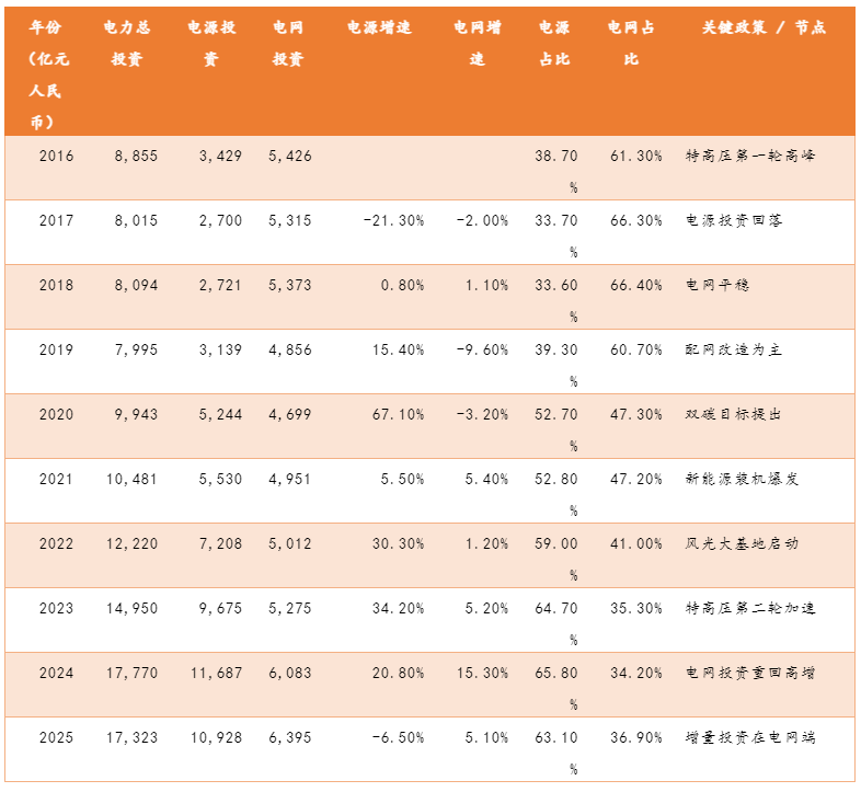 近十年数据显示,电力总投资从2016年的8855亿元增长至2025年的约1.7323万亿元。其中电源投资1.0928万亿元,电网投资6395亿元,增速分别为-6.5%与5.1%。