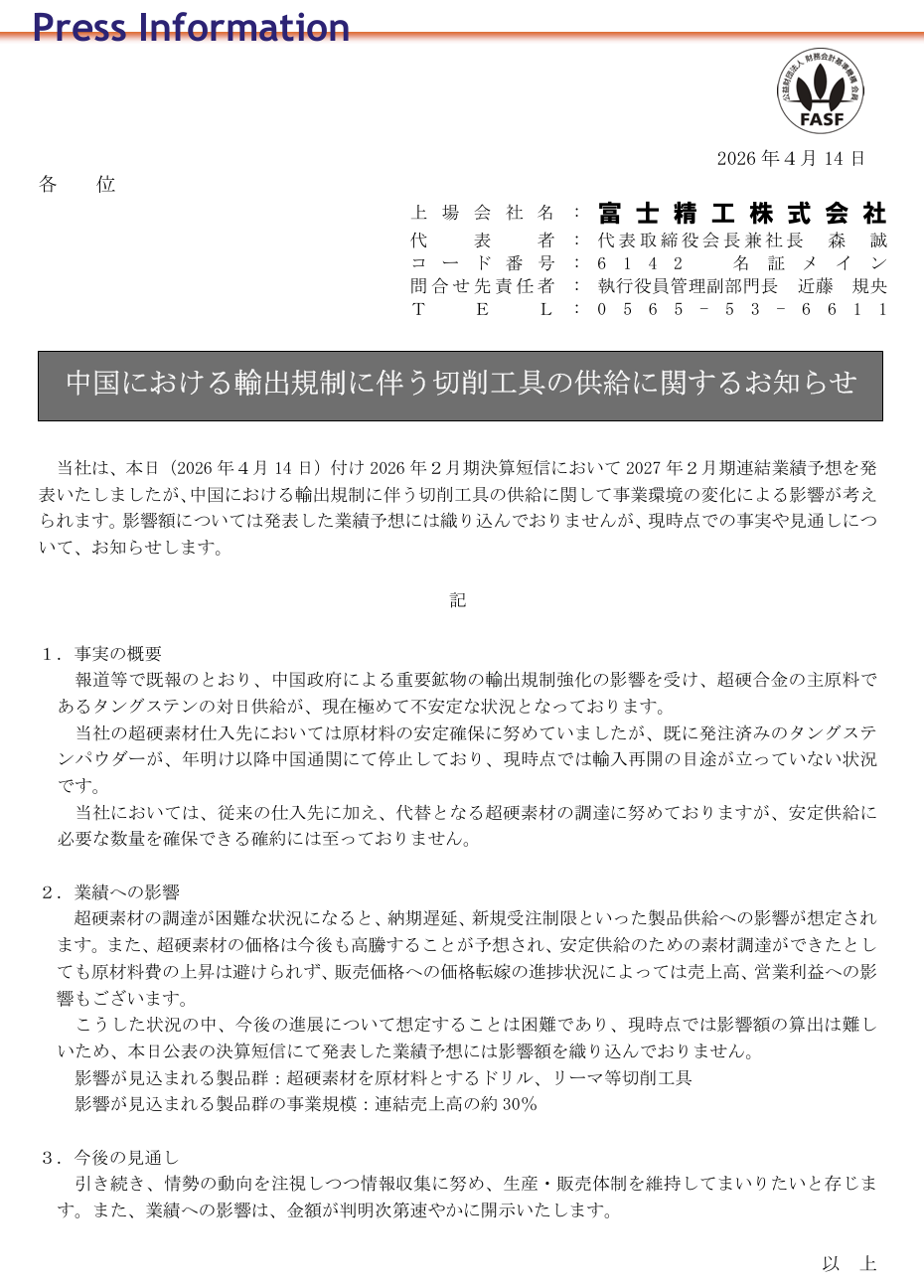 2026年4月14日,日本富士精工株式会社发布公告称,受中国加强钨出口管制影响,公司已面临超硬合金主原料——钨粉的供应危机,占其合并销售额约30%的切削工具产品可能因此出现交货延迟甚至新订单受限。