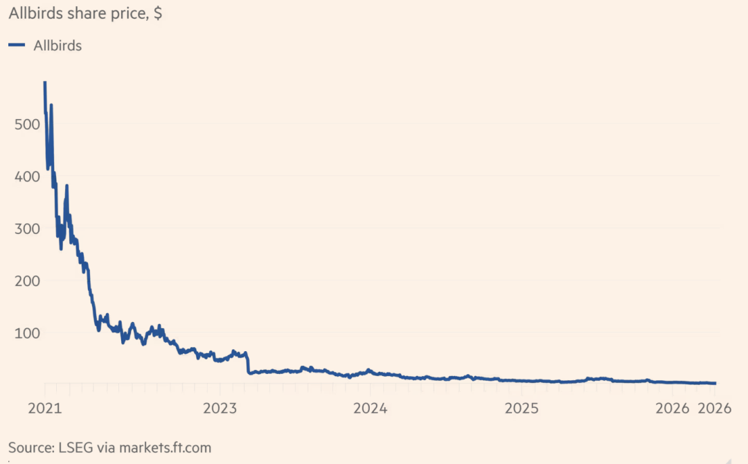 2022年至2025年间,Allbirds的销售额断崖式下跌了近50%,从2.98亿美元萎缩至1.52亿美元,其始终未能实现盈利,股价也从巅峰期的近30美元一路跌入几美分的深渊。