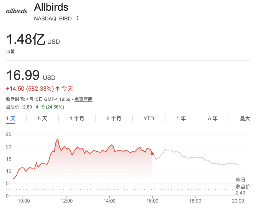 消息一出,沉寂已久的Allbirds股票就像是被注入了某种兴奋剂,开盘即暴涨,盘中一度飙升721%,市值约为1.845亿美元,而就在前一天收盘时,它的总市值还不过区区2100万美元,每股股价徘徊在3美元以下。