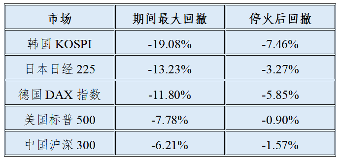 美国的表现处于中性水平——最大回撤较小,停火后已基本收复全部失地,这个结果是多重力量对冲的结果。