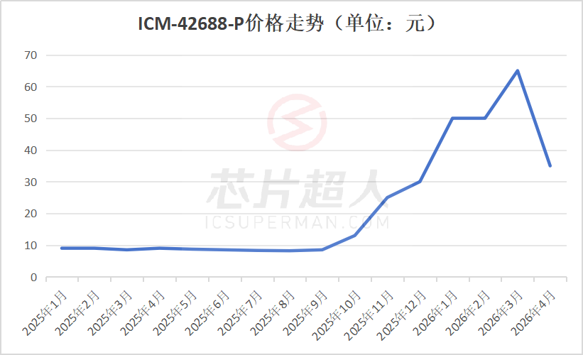 从温和上涨,价格横盘,到大幅暴涨,再到价格腰斩。ICM-42688-P的行情,从2025年9月到2026年4月,历时约八个月。一颗常态售价9元的芯片,最高喊价接近100元,又在一周内跌去一半,到底发生了啥?