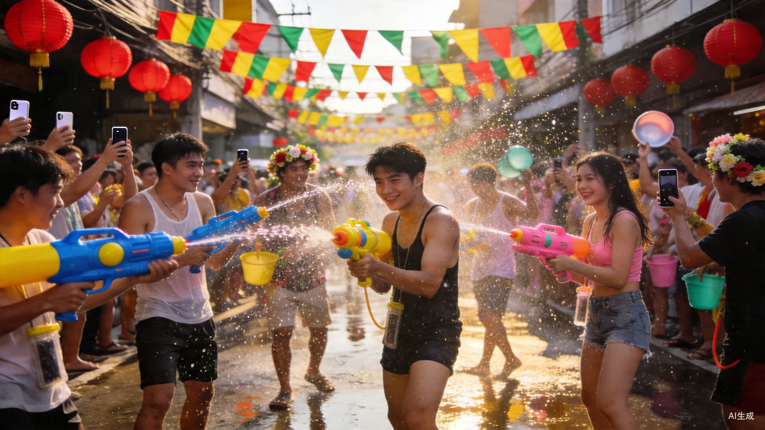 有些西方游客专门购买了高压水枪,背着储水包,这样他们射出的水柱又大又集中,射程很远,被击中还会有点痛。还有些人用的是冰水,哪怕水量不大,也会让你突然「透心凉」一下,在你身上停留很久,像是一种攻击附魔。比较糟糕的就是直接用水桶泼的,虽然不是每次都能击中人,但如果你正好是目标,那避免不了直接浑身湿透,像洗了个澡。还有用水管冲的,完全没有「水会被用完」的后顾之忧,这些能用水管的通常是本地人,你坐车经过的时候就会穿过他们洒下的水帘。我还目睹了一次有人在三楼楼顶朝楼下倒水,楼下的游客完全没注意到,只能迷茫地仓惶逃窜。泼水节这几天是泰国最炎热的几天,水也帮助人们在外降温。
