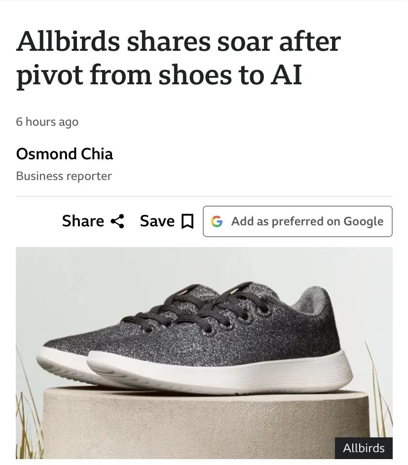 曾经火爆硅谷的羊毛鞋品牌Allbirds,宣布转型做AI,顺手把名字改成了NewBird AI,股价一天涨了600%。