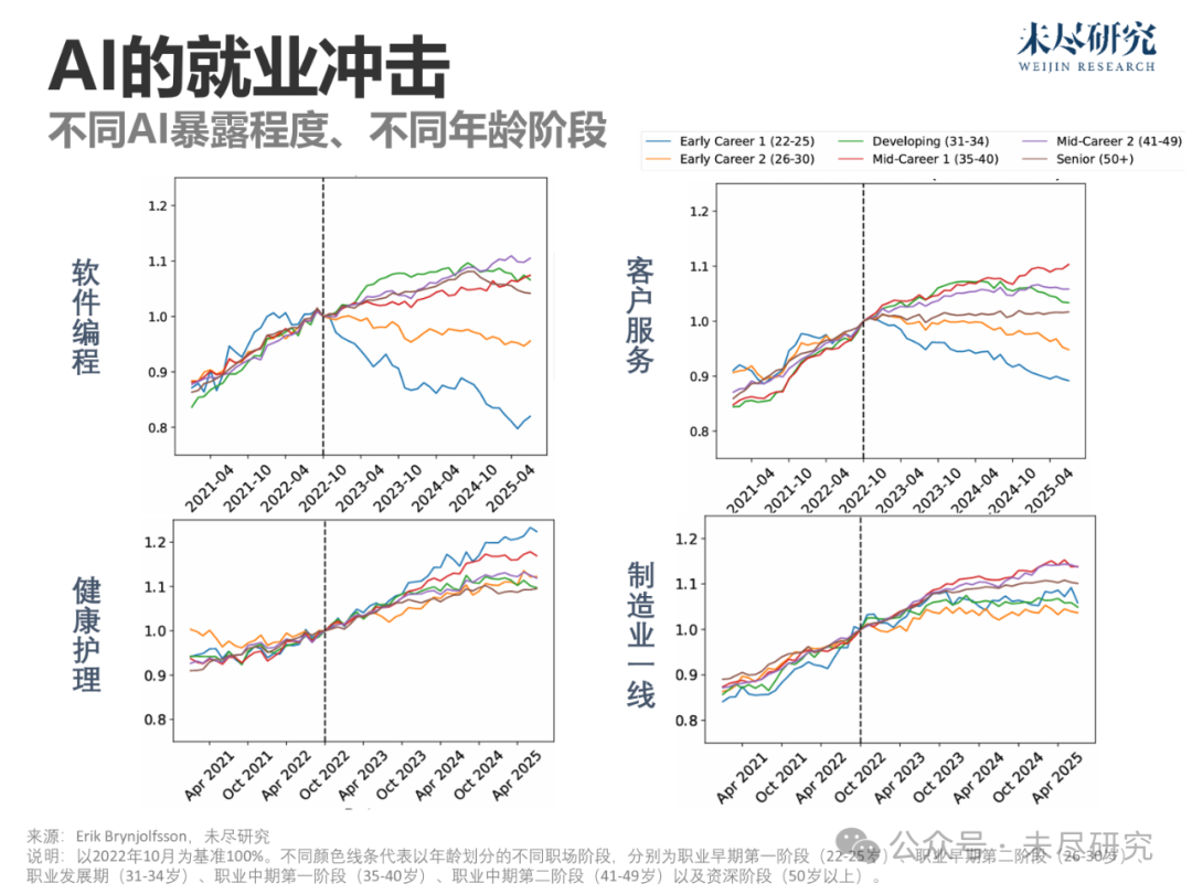关于这三名袭击者的个人动机,目前信息有限。但他们的年龄都在20到25岁之间,这或许并非巧合。据斯坦福大学数字经济实验室利用ADP就业数据做的一项研究显示,自大语言模型普及以来,22至25岁年轻人在“AI高暴露岗位”上的就业率下降了16%。Anthropic今年3月发布的报告更为直白:程序员75%的日常任务已被AI覆盖,客服代表70%,数据录入67%。