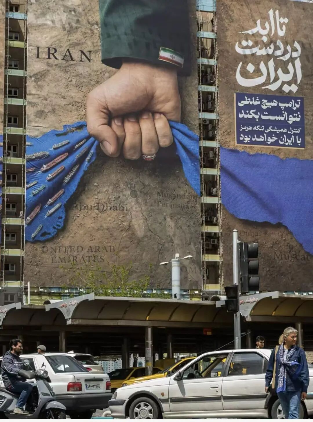 德黑兰一处广告牌上绘有霍尔木兹海峡图案,并悬挂着一条写有“永远掌控在伊朗手中”的横幅。图源:《纽约时报》