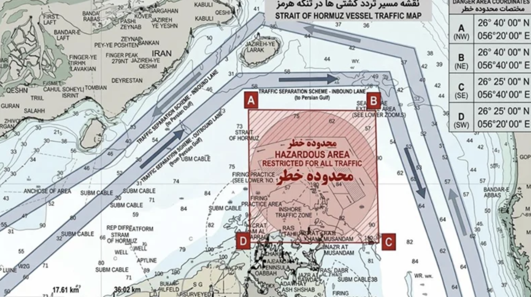 4月9日伊朗国家安全委员会发布的霍尔木兹海峡分道通航方案。图源:伊斯兰革命卫队